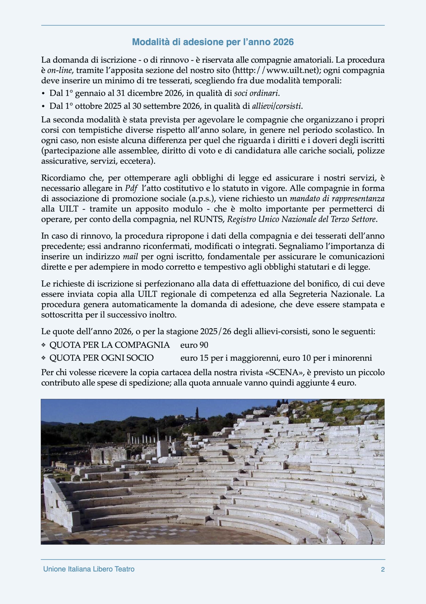 La quota totale di affiliazione di ogni Compagnia risulta dalla somma della quota nazionale e regionale, che dall’anno 2021 è stata parificata in tutto il territorio nazionale. Ad essa vanno aggiunte le quote individuali per ogni aderente alla Compagnia, sulla base dell’elenco inserito nel sito gestionale UILT. Per l’anno 2026, le cifre sono le seguenti: