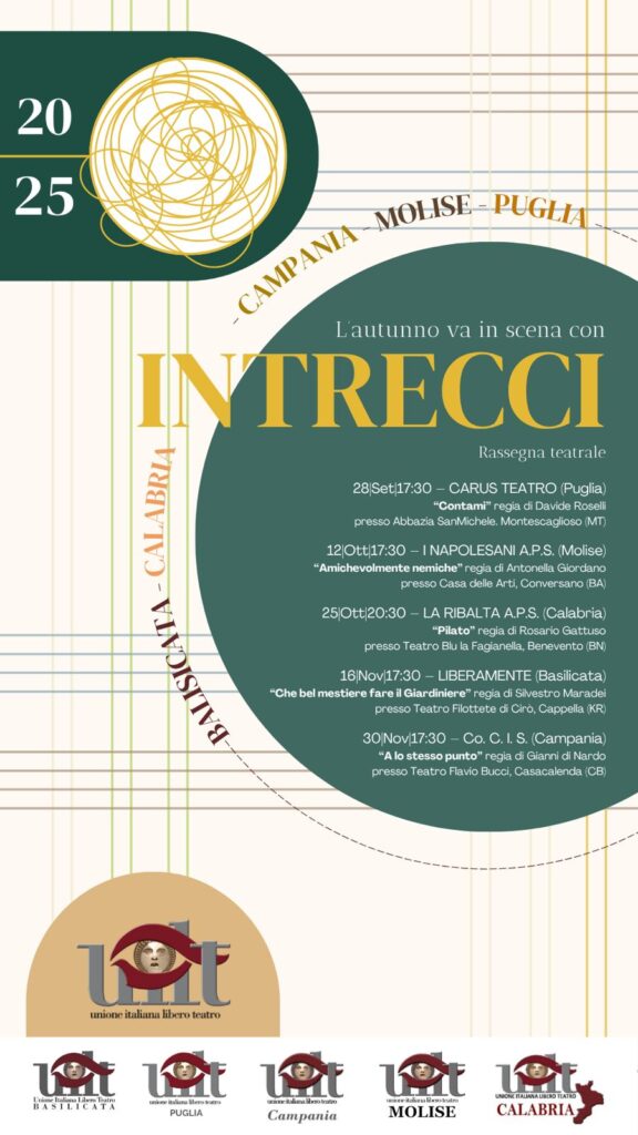 U.I.L.T. – Unione Italiana Libero Teatro CONVEGNO NAZIONALE SUL TERZO SETTORE. ANALISI E PROSPETTIVE Sabato 12 ottobre 2024 ore15 Teatro degli Eroi – Via Savonarola 36/m – Roma Relatori: PAOLO ASCAGNI – presidente nazionale della UILT. MARINA MONTALDI – componente esperto del Consiglio Nazionale del Terzo Settore. GIACINTO PALLADINO – componente del Consiglio di amministrazione […]